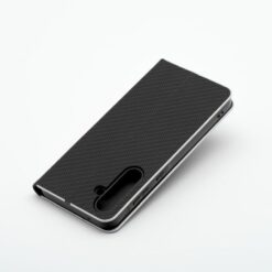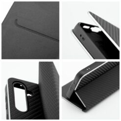 Elegantné knižkové puzdro Luna Carbon čierne pre mobilné telefóny Samsung Galaxy A36 s kovovým rámom pre lepšiu ochranu telefónu. Atraktívna textúra a materiál príjemný na dotyk vytvárajú štýlové puzdro s moderným dizajnom.