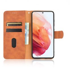 Peňaženkové puzdro na Samsung Galaxy S21 FE chráni telefón pred poškriabaním aj poškodením následkom pádu. Peňaženkové puzdro Solid hnedé z kvalitnej syntetickej kože zaujme tiež svojím vzhľadom, príjemným povrchom a mäkkosťou. Vnútorná vanička je z pevného TPU, ktorý prispieva k bezpečnosti smartfónu a výborne sa prispôsobí jeho tvaru. Toto knižkové puzdro na mobil s magnetickým zavieraním vám umožní využívať telefón bez obmedzení bez toho, aby ste ho z neho museli vyberať.